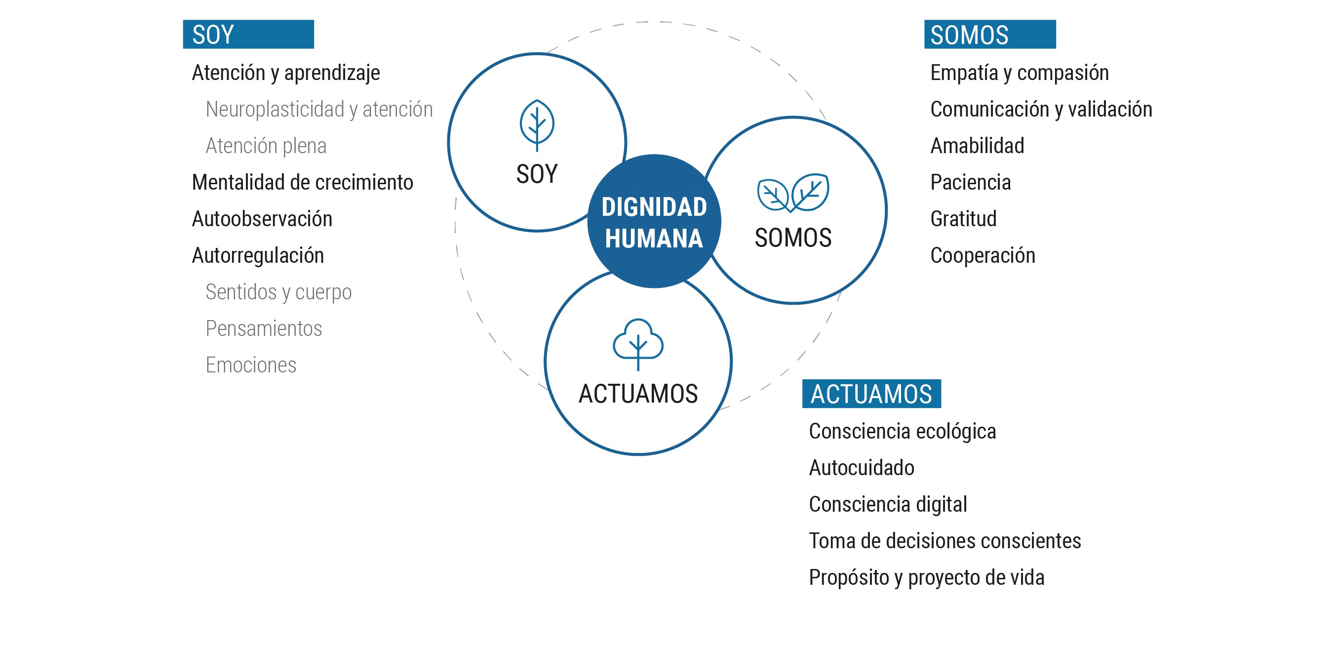 La consciencia de la interdependencia (somos con los otros) se entiende como la habilidad para: empatizar y tomar perspectiva de los demás considerando las diferentes culturas y contextos; establecer y mantener relaciones saludables y de apoyo para navegar eficazmente los diversos entornos y grupos honrando y respetando la propia individualidad.